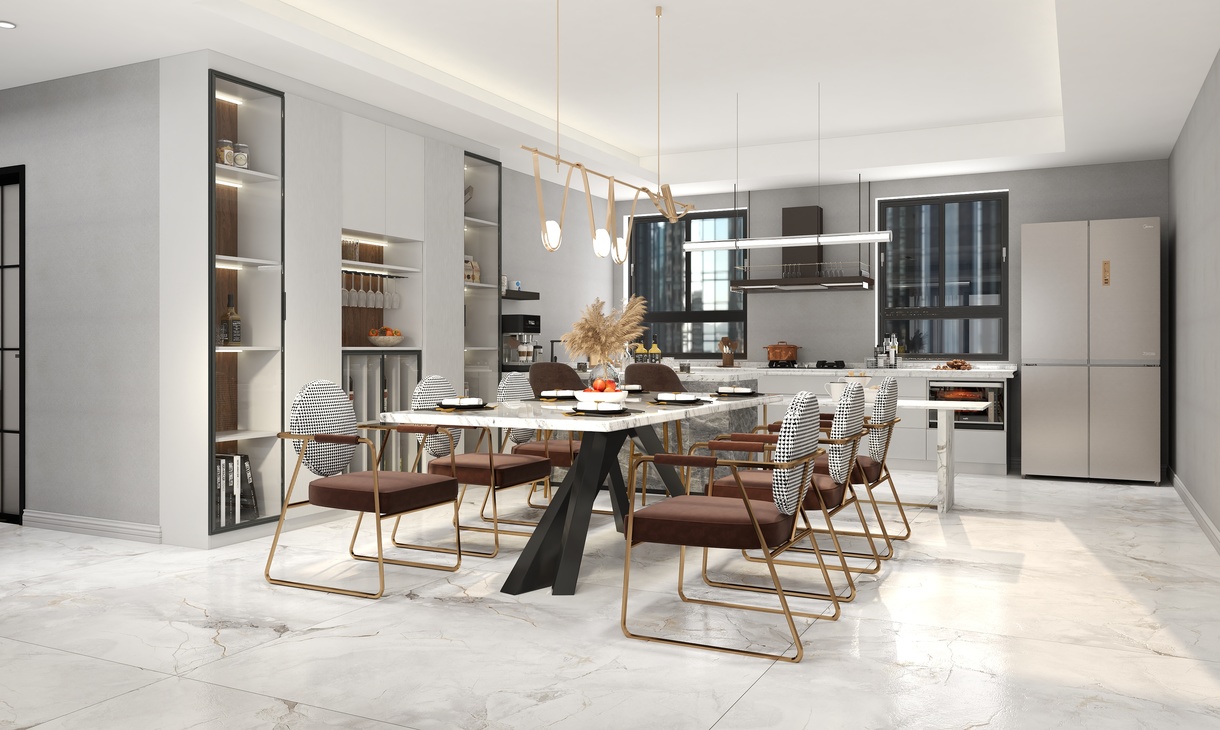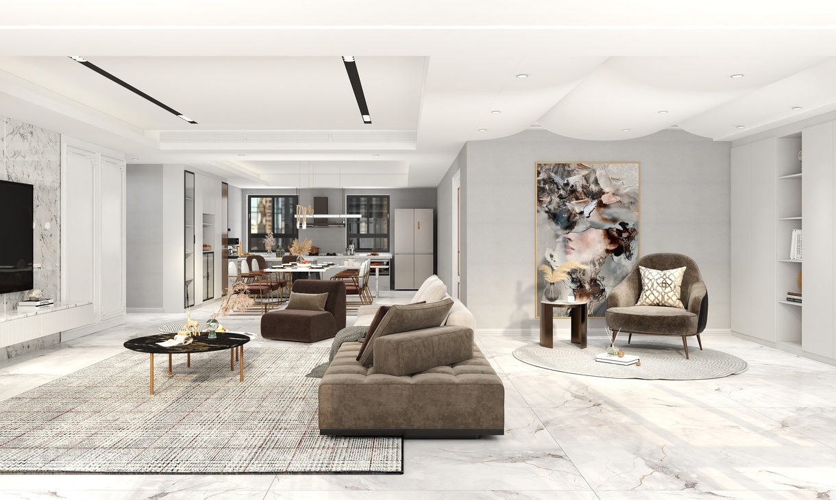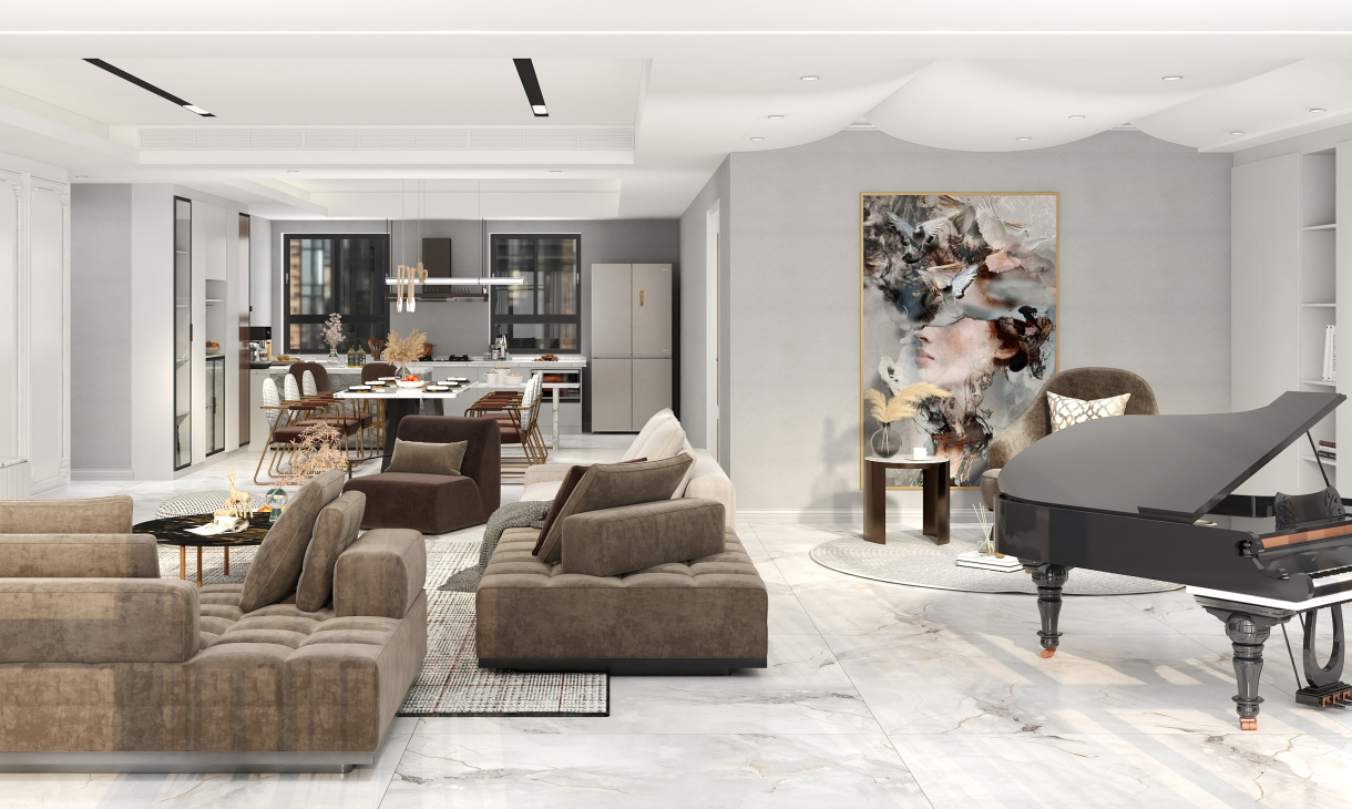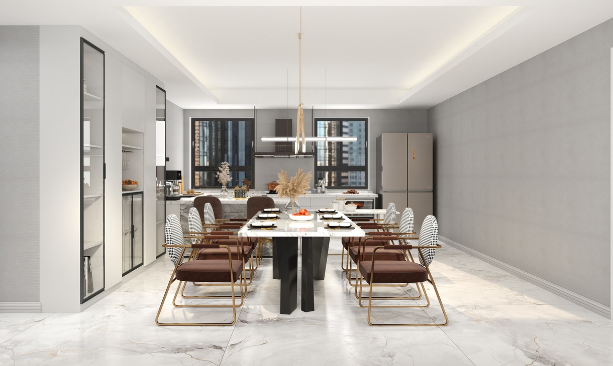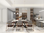 風格輕奢簡約,簡約卻不簡單,清爽又柔和,餐廳、廚房融為一體,是一家三餐四季一起的最佳助手。