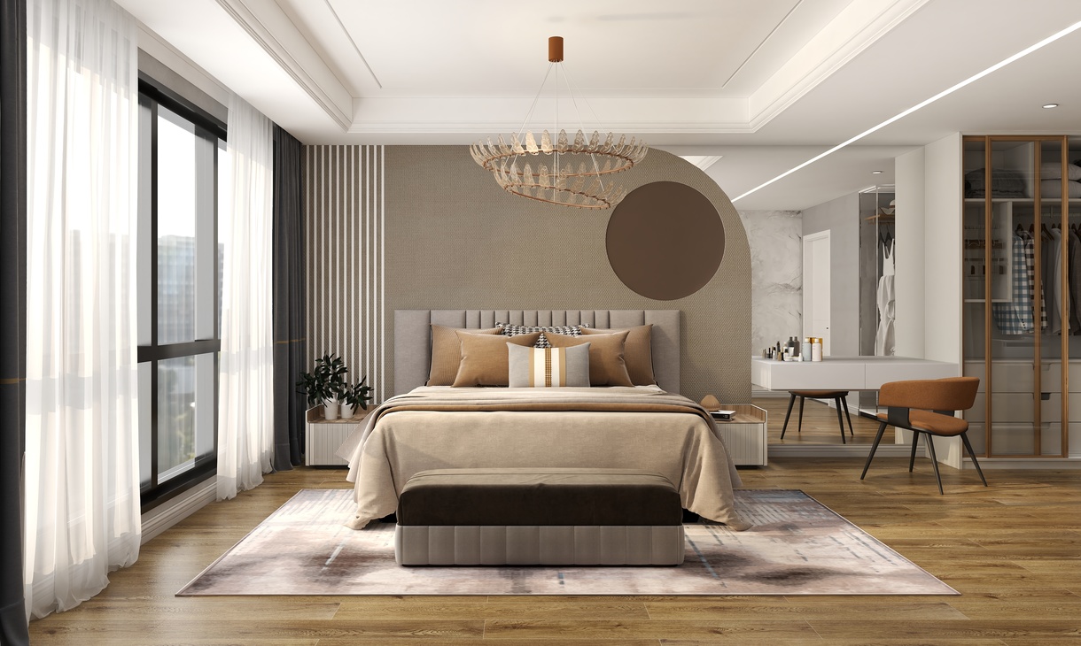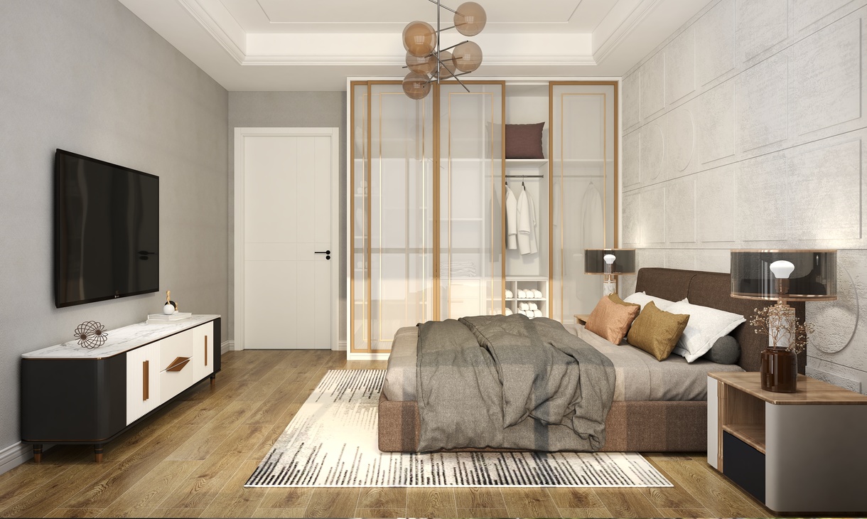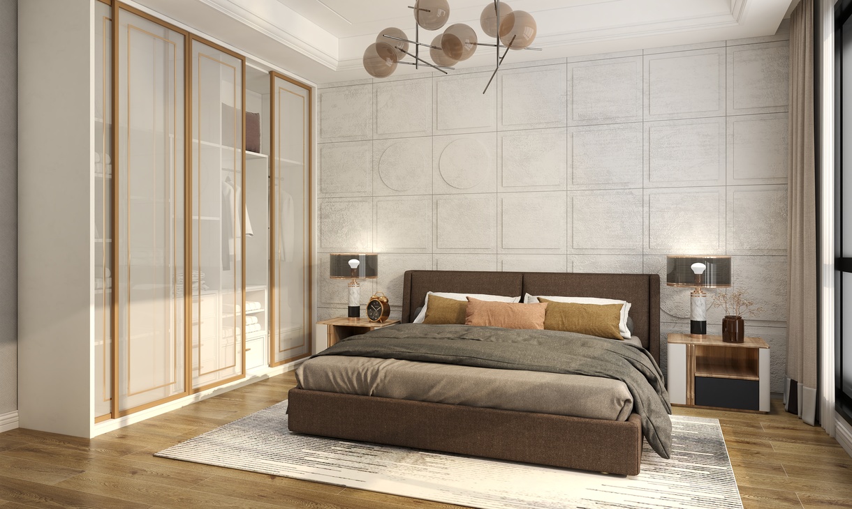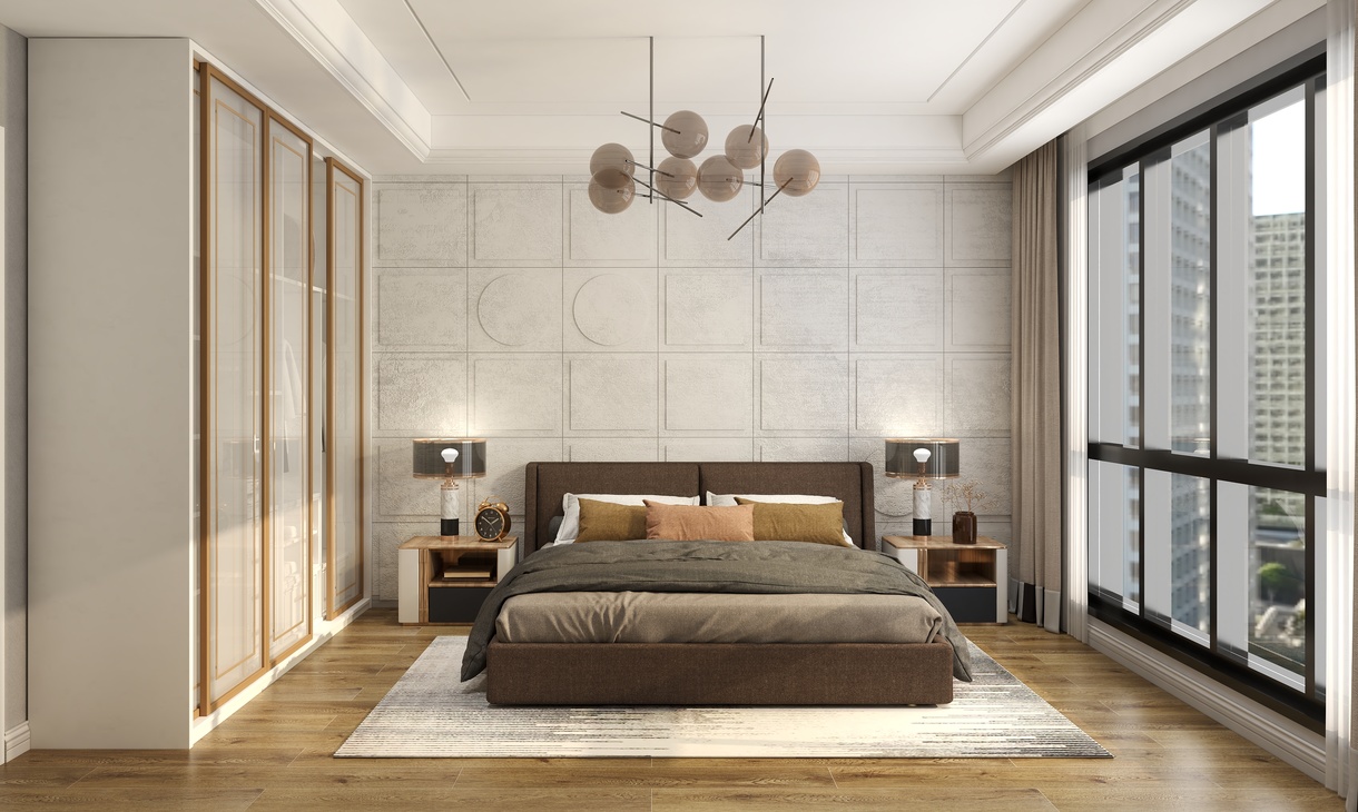 主臥有著幾何圖案的設計,再輔以深淺不一的色調的方格來構造空間,從而打造出一個極具層次感的空間,有效避免了空間的單調清冷感,演繹出滿滿優雅氣息。